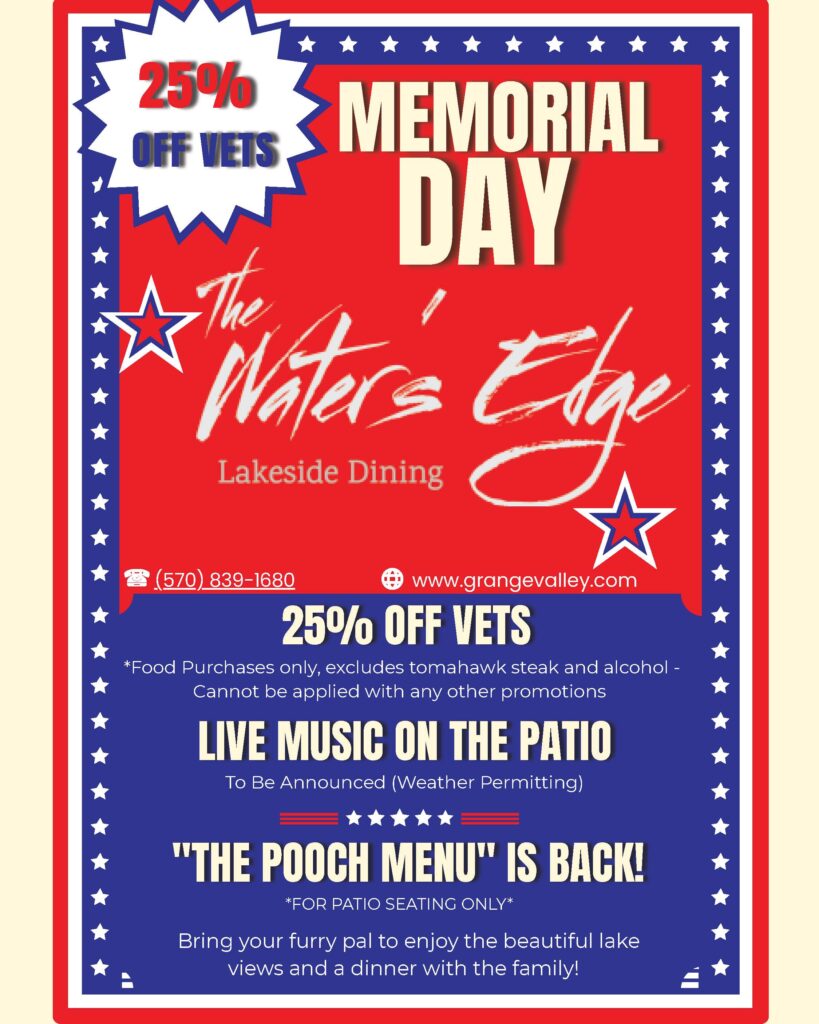 Join us for a festive and fun start to summer at The Water’s Edge Restaurant at Grange Valley—perfect for families, friends, and anyone looking to enjoy the holiday weekend in a beautiful setting.