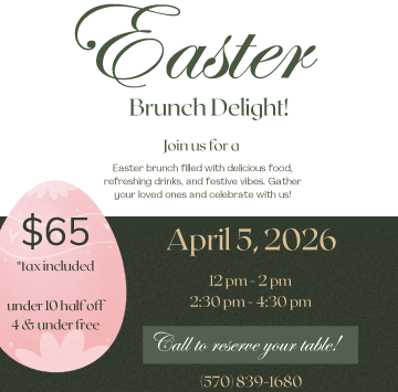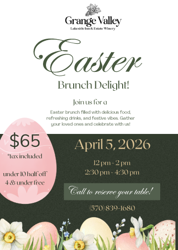 Celebrate the joy of spring and the magic of Easter at Grange Valley Lakeside Inn & Estate Winery with our unforgettable Easter Brunch Event—a fun-filled, family-friendly celebration set against our beautiful lakeside backdrop. Join us for a festive gathering featuring a plentiful brunch spread, refreshing beverages, and a warm, welcoming atmosphere perfect for guests of all ages. Families can relax, indulge, and make lasting memories while children delight in one of the most anticipated highlights of the day: a lively Easter Egg Hunt on our scenic grounds and a special appearance by THE EASTER BUNNY! With plenty of smiles, laughter, and photo opportunities throughout the event, it’s the perfect way to capture those cherished holiday moments. This Easter Brunch is ideal for starting a new tradition or continuing a beloved one, bringing everyone together for a joyful celebration filled with great food, festive fun, and springtime cheer. Advance tickets are required, and guests must call to purchase tickets for this special event. Please contact Guest Services at 570-839-1680, option 1 to secure your tickets and reserve your place at this exciting, memory-making Easter celebration. 🐣🌷🥂 PLEASE NOTE: **Grange Valley reserves the right to cancel the event due to lack of participation or for any other reason whatsoever prior to March 26th and will be limited to the return of payment in full as liquidated damages.** |